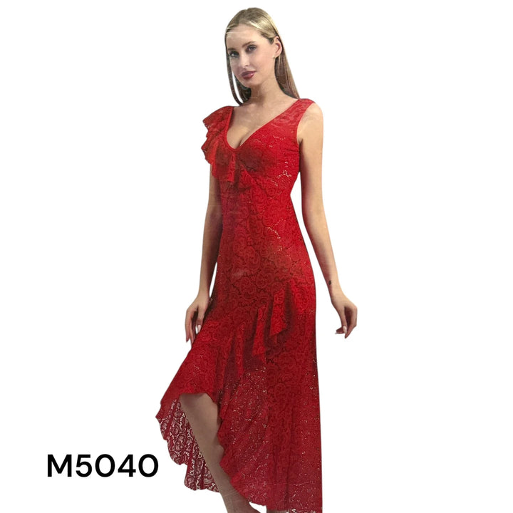 Red Lace V-Neck Sleeveless Hi-Low Ruffle Dress M5040