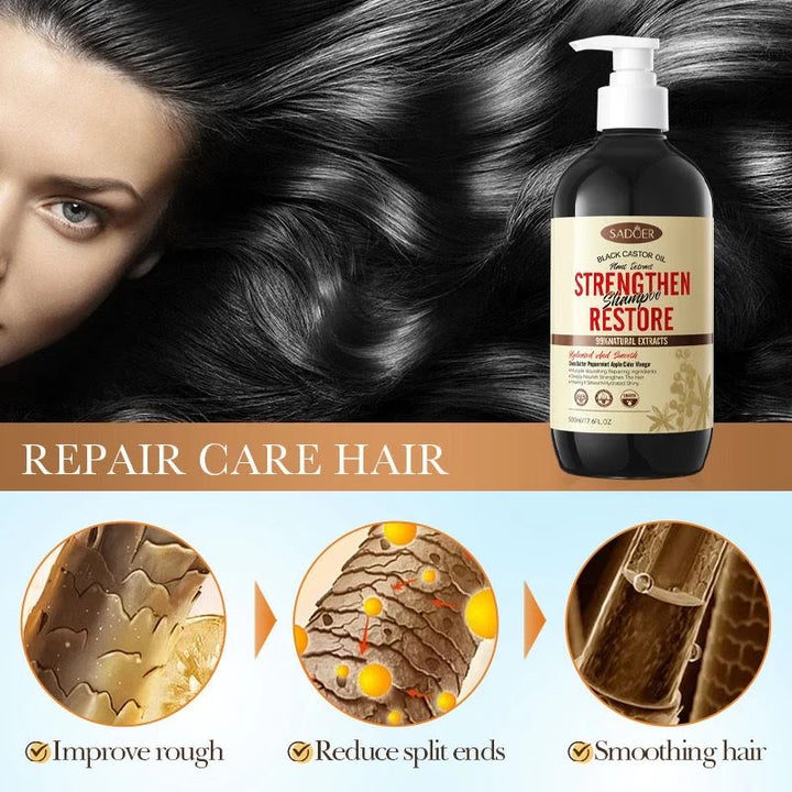 Revitalize your hair with SADOER Black Castor Oil Strengthen Restore Shampoo — the perfect blend of strength, hydration, and natural care for beautiful, resilient hair every day.